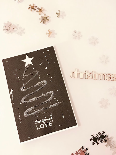 Para la estrella la he troquelado en cartulina blanca brillante con una troqueladora de palanca y he estampado el sello de Christmas love con tinta transparente que luego he embotado con polvos blanco.