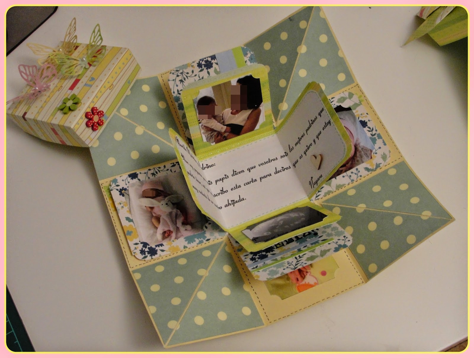 Mi amiga Elena, que sobre valora mi trabajo, me pidió para el "no bautizo" de sus mellizos unas explonding box para regalar a sus madrinas.