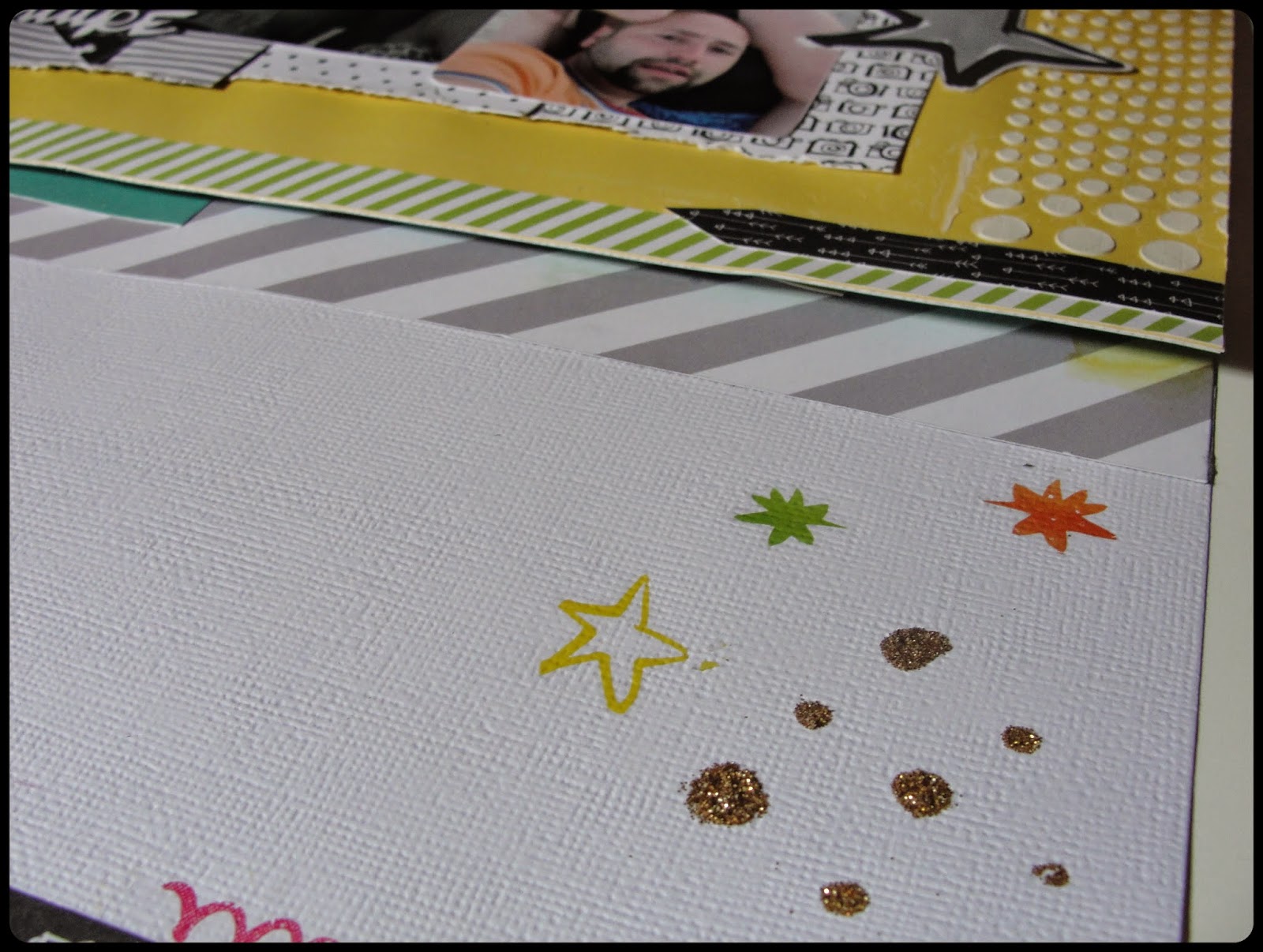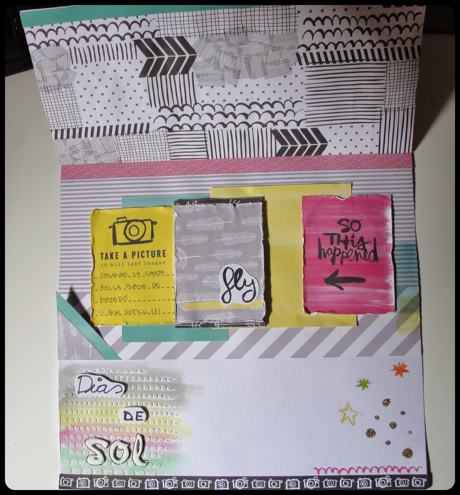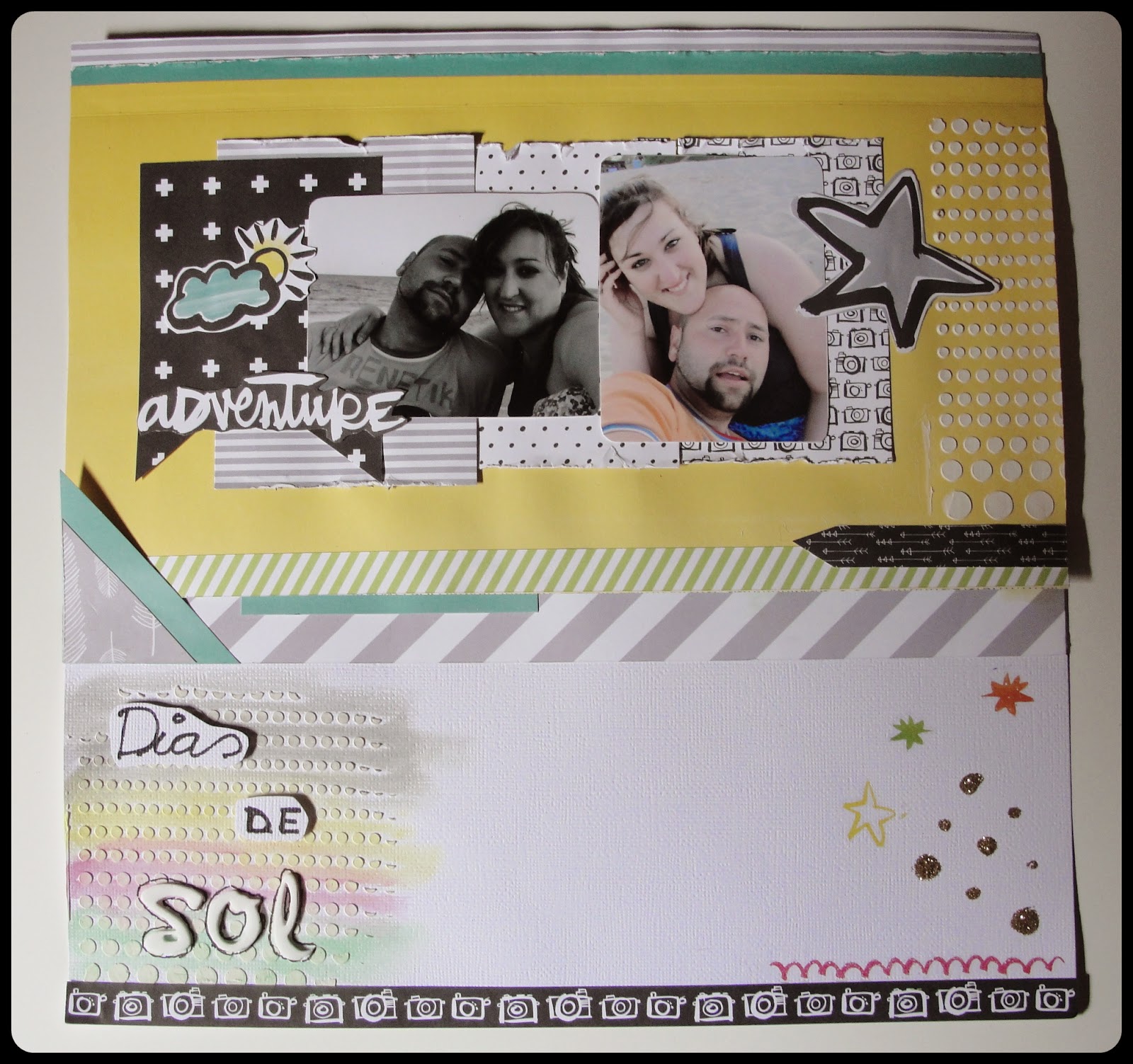 Utilizamos los papeles de la colección Plus One de Amy Tangerine, una colección llena de color y verano. Yo había elegido unas fotos de un día de playa donde volamos una cometa y quedó genial.