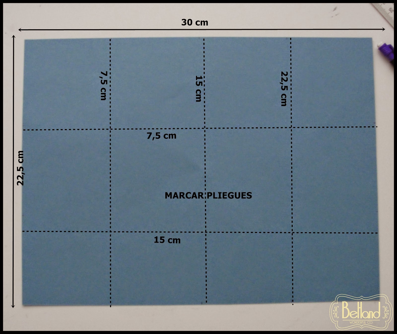 2- Ahora vamos a marcar los pliegues. Yo he usado la plegadora y los he marcado tal y como podeis ver en la foto. Han de quedar 12 cuadrados de 7,5x7x5