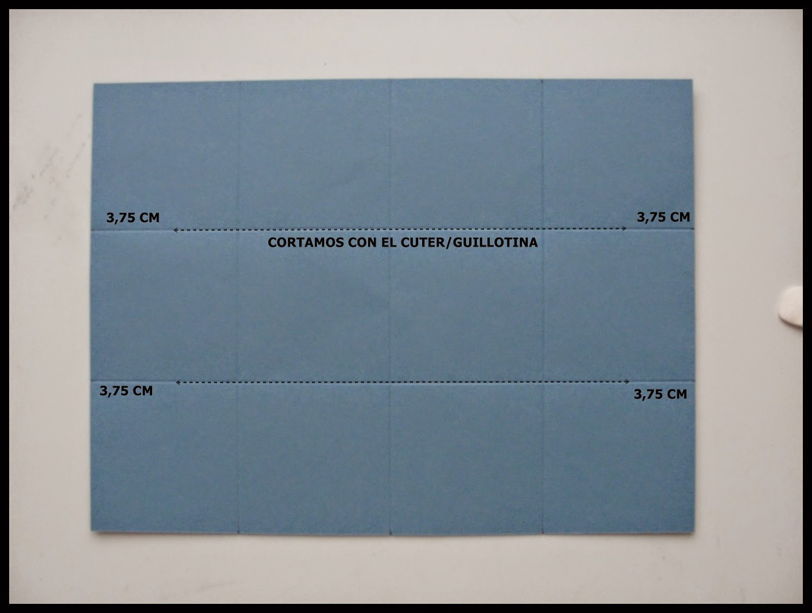 3- A continuación cortaremos con el cuter las lineas centrales dejando como margen 3,75cm. Con esto podremos hacer el efecto zig-zag. Despues marcaremos un pliegue entre ambos cortes a los 3,75cm